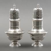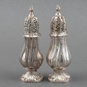 Een samengesteld paar zilveren Louis Quinze strooiers, balustervormig getorst model, het deksel ajourgezaagd en geciseleerd met bladmotieven en vlamvormige knop, één meester: Jan Willem Burger, 's-Gravenhage, 1764, tevens met herkeur 's-Gravenhage, 1795, de ander meester: Engelbart Joosten Jr., 's-Gravenhage, 1775, gewicht 463 gram, hoogte 15,5 cm