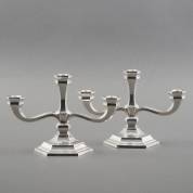 Paar 2e gehalte zilveren drielichts kandelaars op zeskantige getrapte voet, Duitsland, circa 1930, brutogewicht 1252 gram, 20 × 27 cm