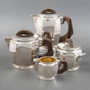 Octagonaal 1e gehalte zilveren koffie- en theeservies met houten grepen en vermeil binnenzijde, bestaande uit: koffiepot, theepot, bedekte suikerpot en melkkan, meesterteken PB met lopende leeuw, Frankrijk, art deco, brutogewicht 1907 gram, koffiepot 18 × 18 × Ø 9 cm
