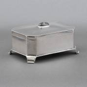 Octagonaal gevormd 2e gehalte zilveren juwelendoosje met paars velours binnenzijde, de deksel gesierd met ovale cabochongeslepen boulderopaal, Nederland, 1922, brutogewicht 169 gram, 4,5 × 9,5 × 6,5 cm