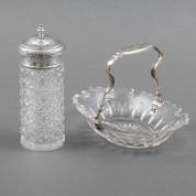 Kristallen strooibus met zilveren montuur, meester: J.M. van Kempen & Zonen, Voorschoten, 1858-1924, en kristallen mand met zilveren hengsel, meester: Antonius Hendrikus der Kinderen, 's-Hertogenbosch, 1862, brutogewicht 824 gram, strooibus 17,5 cm -kristallen mand met defecten-