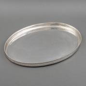 Ovaal 2e gehalte zilveren dienblad met opstaande galerierand afgezet met parelrand, meester: A. Presburg & Zoon, Haarlem, 1973, gewicht 998 gram, 2,5 × 43 × 33 cm