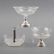 Kristallen mandje met 2e gehalte zilveren hengsel, circa 1820 -chips-, en twee kristallen schaaltjes op 2e gehalte zilveren voet, 19e eeuw, hoogste 12 × Ø 15 cm -chips-