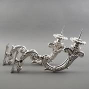 Paar 2e gehalte zilveren wandkandelaars met gedreven decor van bladeren en bloemen, meester: Cornelis Ernst Held, Amsterdam, 2e helft 19e eeuw, brutogewicht 2371 gram, circa 40 × 48 × 11 cm -gegraveerd met twee initialen en 1883-