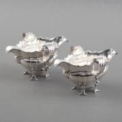 Paar sierlijke zilveren sauskommen op vier pootjes en gekrulde greep, meesterteken: pistool, gewicht 746 gram, 12 × 20 × 15 cm -slechts gekeurd met belastingstempel 1906-1953-