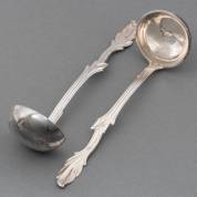 Paar 1e gehalte zilveren sauslepels met lange steel met bladmotief, meester: Bonebakker & Zoon, Amsterdam, begin 20e eeuw, gewicht 172,8 gram, 20 cm