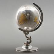 1e gehalte zilveren draaibare globe, op visvormige standaard, brutogewicht 629 gram, 20 cm -bol heeft deukjes-