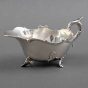 1e gehalte zilveren Louis Quinze saucière met rand van voluten, de takvormige greep uitlopend in drie bladvormige pootjes, meester: Engelbart Joosten Sr., 's-Gravenhage, 1774, gewicht 492 gram, 11 × 21,5 × 11,5 cm -pootjes iets ingedrukt-