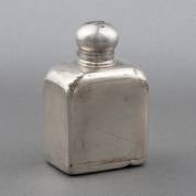 1e gehalte zilveren flacon, de dop met gegraveerd helmteken in de vorm van een zwaan, London, eind 19e eeuw, gewicht 104 gram, hoogte 9 cm -gebruikssporen-