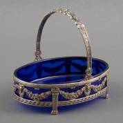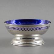3e gehalte zilveren schaal met ajourgezaagde motieven, op standring, met blauw glazen binnenbak, Oostenrijk-Hongarije, 1872-1922, gewicht zilver 241 gram, 9,5 × Ø 19 cm