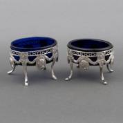 Paar 1e gehalte zilveren zoutvaatjes met bloemguirlandes, portretmedaillons en blauw glazen binnenbakje op vier pootjes, meester: Johannes Hartsman, Amsterdam, 1780, gewicht zilver 103 gram, 5 × 7 × 5,5 cm -één glazen binnenbakje dikker uitgevoerd-