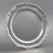 Ronde 3e gehalte zilveren (826/1000) serveerschaal met geaccoleerde filetrand, verantwoordelijkheidsteken: Johannes Sigaard, Kopenhagen, 20e eeuw, gewicht 648 gram, Ø 31 cm