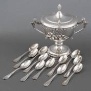 3e gehalte zilveren bedekte suikervaas met twaalf rocaille lepeltjes, Italië, 20e eeuw, gewicht 285, 15 × Ø 10,5 cm
