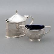 1e gehalte zilveren mosterdpotje met blauwglazen binnenbakje en zoutschaaltje met blauwglazen binnenbakje, meester: Goldsmiths & Silversmiths Co., Londen, 1895 en later, gewicht zonder glas 106 gram