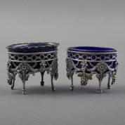 Paar zilveren zoutschaaltjes met bloemen- en druivenranken met blauw glazen binnenbakjes, meester: Paulus van Beugen, 's-Hertogenbosch, 1792-1793, gewicht zilver 155 gram, 6 × 9 × 6 cm -één blauw glazen bakje afwijkend en niet geheel passend, beide met één missend druiventrosje, restauraties-