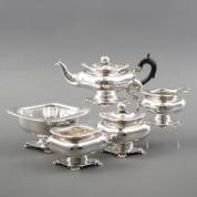 Vijfdelig 1e en 2e gehalte zilveren theeservies met palmetdecor en gegraveerde rocailles, bestaande uit: theepot, suikerpot, roomkan, theebus en spoelkom, vier delen 1e gehalte zilver, meester: J.H. Carstens, Amsterdam, 1846, de spoelkom 2e gehalte zilver, meester: Jan Antoon Boerman, Venlo, 1879, brutogewicht 1330 gram, theepot 12,5 × 25 × 15 cm -theepot heeft deukje-