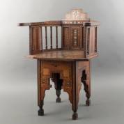 Moors stoeltje met inlegwerk van diverse houtsoorten en parelmoer, Syrië, 20e eeuw, -fineerverlies, een verbinding in de rugleuning defect, minieme defecten-, 76 × 58,5 × 47 cm