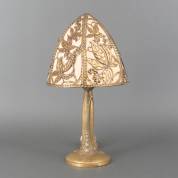 Tafellamp, de kap met messing bladdecor en perkament, de messing voet met rozendecor, art nouveau -geëlektrificeerd, van origine een petroleumlamp-, 55 cm hoog