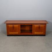 Bubingagefineerd laag tv-meubel / dressoir met drie vakken, waarvan twee met klep en één open, model Cranston, uitvoering Schuitema, 54 × 166 × 45 cm