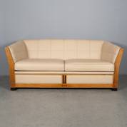 Tweezits bank met beige lederen bekleding, het bubinga frame rondom met gezwarte en eiken accenten, model Lawrence, uitvoering Schuitema, 70 × 183 × 81 cm