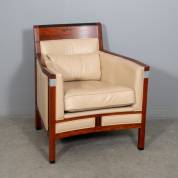 Fauteuil met beige lederen bekleding en bubinga frame, model Rennie, uitvoering Schuitema