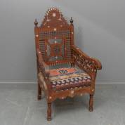Syrische of Moorse armstoel met snijwerk en ingelegd met parelmoer, de zitting bekleed met een stuk kelim, 19e/20e eeuw, 115 × 64 × 65 cm