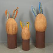 Claire Begheyn (1950), diorama van drie paaseieren, hout, brons, staal en nepbont, gesigneerd aan binnenzijde van sokkel, 2000, de hoogste 132 cm hoog