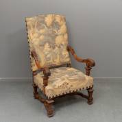 Notenhouten armstoel met getorste stijlen en gestoken tussenregel, de armleuningen versierd met acanthusbladmotieven, bekleed met gobelinstof met boslandschapsdecor, Louis Quatorze-stijl en mogelijk periode -gobelinstof bij de knieën licht versleten-, 117 × 71 × 74 cm
