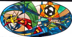 Ovaal glas-in-loodraam: vogels en vissen, onderin gesigneerd en gedateerd Alex. L. '67, mogelijk uitvoering (atelier van) Alex Luigjes sr., Amersfoort, 90 × 172 cm