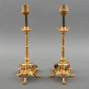 Paar verguld bronzen lampvoeten, staand op drie klauwpoten -geen kapjes-, 40 × Ø 14 cm