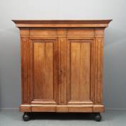 Notenhouten Drentse pastoorskast rustend op gezwart houten bolpoten, voorzien van lade onder de deuren, het interieur eveneens met twee laden, circa 1700 -fineerverlies, verkleuring, enigszins instabiel-, 202 × 188 × 64 cm