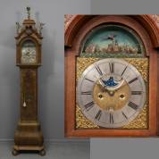 Amsterdams staand horloge in wortelnotengefineerde kast, de wijzerplaat met polychroom beschilderd scheepjesmechaniek, verzilverde cijferring, verguld metalen hoekstukken, datum- en maanaanduiding, gesigneerd Otto van Meurs, Amsterdam -marriage, aanpassingen aan het uurwerk en vermoedelijk niet uit de 18e eeuw, kast van later datum, gebruikssporen-, 267 × 67 × 32 cm