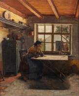 Aloïs Boudry (1851-1938), interieur met vrouw aan tafel, olieverf op doek, r.o. gesigneerd -retouches, herstellingen-, 56 × 46 cm