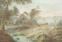 Vermoedelijk Joseph August Knip (1777-1847), landschap met pluimvee, aquarel op papier, niet gesigneerd, verso toegeschreven aan, 26 × 38 cm