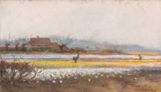 Anton Louis Koster (1859-1937), twee mannen aan het werk in het bollenveld, pastel, r.o. gesigneerd, 24 × 41,5 cm