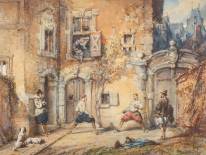 Eugène Louis Gabriel Isabey (1804-1886), duel op een binnenplaats, aquarel en gouache op papier, r.o. gesigneerd, 24 × 31 cm