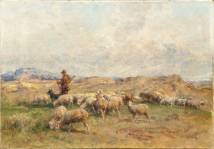 Henri Émilien Rousseau (1875-1933), schaapsherder met kudde, olieverf op doek, r.o. gesigneerd -beschadiging in doek links midden-, 38 × 55 cm
