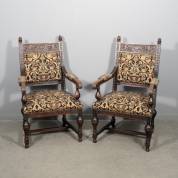 Paar gesneden eiken stoelen met zwart-gouden bekleding, begin 20e eeuw