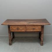 Kastanjehouten tafel met twee lades, Spanje, 17e eeuw -slijtages en oude houtwormschades-, 79 × 155 × 73 cm