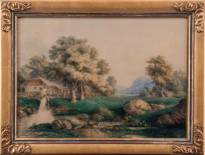 Hollandse School: ingang naar een buitenplaats, met aan de linkerzijde een theekoepel, aquarel op papier, niet gesigneerd, 19e eeuw -enkele verkleuringen en roestvlekjes, scheurtje links midden-, 43 × 58 cm