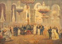 Schilderij: Europees hof, olieverf op paneel, r.o. gemonogrammeerd C.R., tweede helft 19e eeuw, 27 × 38 cm