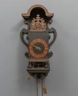 Groninger stoelklok met één wijzer, de donkergroengeschilderde kast met roodgeschilderde cijferring en gele cijfers, voorzien van eendaags spillegang uurwerk, eerste helft 18e eeuw, inclusief drie gewichten, slinger en een taxatierapport uit 1991 -enkele defecten en restauraties-, circa 65 × 33 cm