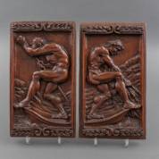 Twee eiken (meubel)panelen met reliëfdecor van mannen op een boot, 36,5 × 21 cm