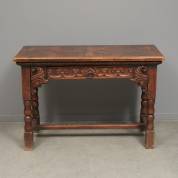 Eiken wandtafeltje met lade met gesneden cornucopiadecor, het onderstel met regelverbinding, 19e eeuw, 81 × 118 × 55 cm