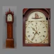Engels staand horloge in mahonie kast met meandervormige bies, de beschilderde wijzerplaat met decor van een schip, gesigneerd J. Stanford, So(uth) Walsham, regency, inclusief slinger, twee gewichten en sleutel, 238 × 49 × 25 cm