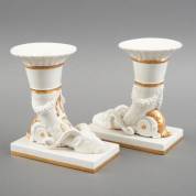 Paar porseleinen cornucopiae met vergulde accenten, eindigend in ramskoppen, uitvoering Porcellane d'Arte Dr. Ermete Agostinelli, Bassano, Italië, tweede helft 20e eeuw, 20 × 18,5 × 10 cm