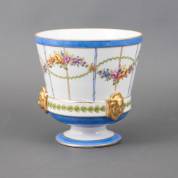 Porseleinen overpot met blauwe en gouden biezen, vergulde hoofdjes en polychroom bloemguirlandes -bakfout in wand-, 22,5 × Ø 22,5 cm