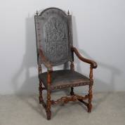 Notenhouten armstoel, de lederen zitting met rozetvormige siernagels en reliëfdecor: putti en wijnranken, herkomst volgens inzender: kasteel Gunterstein, Breukelen