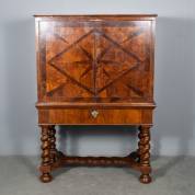 Wortelnoten kruisvoetkabinetje, de bovenkast met twee deuren waarin ieder een halve ster ingelegd, het onderstel op gedraaide poten verbonden door regel, 20e eeuw -lichte scheurvorming in het fineer van de deuren, slijtage aan de boven- en onderrand-, 151 × 107 × 54 cm