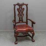Mahonie armstoel met opengewerkte rugleuning en lederen zitting, de bolklauwpoten verbonden door regel, Chippendale-stijl, 20e eeuw -leer een beetje gebarsten, minieme defecten-, 123 × 69 × 57 cm